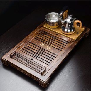 Khay Trà Gỗ – Mã KTG18 kiểu giáng đơn giản, màu sắc nâu gỗ sẽ phù hợp với nhiều bộ bàn ghế, ở giữa khay trà có hoa văn trang trí rồng, phượng đang uốn tròn.
